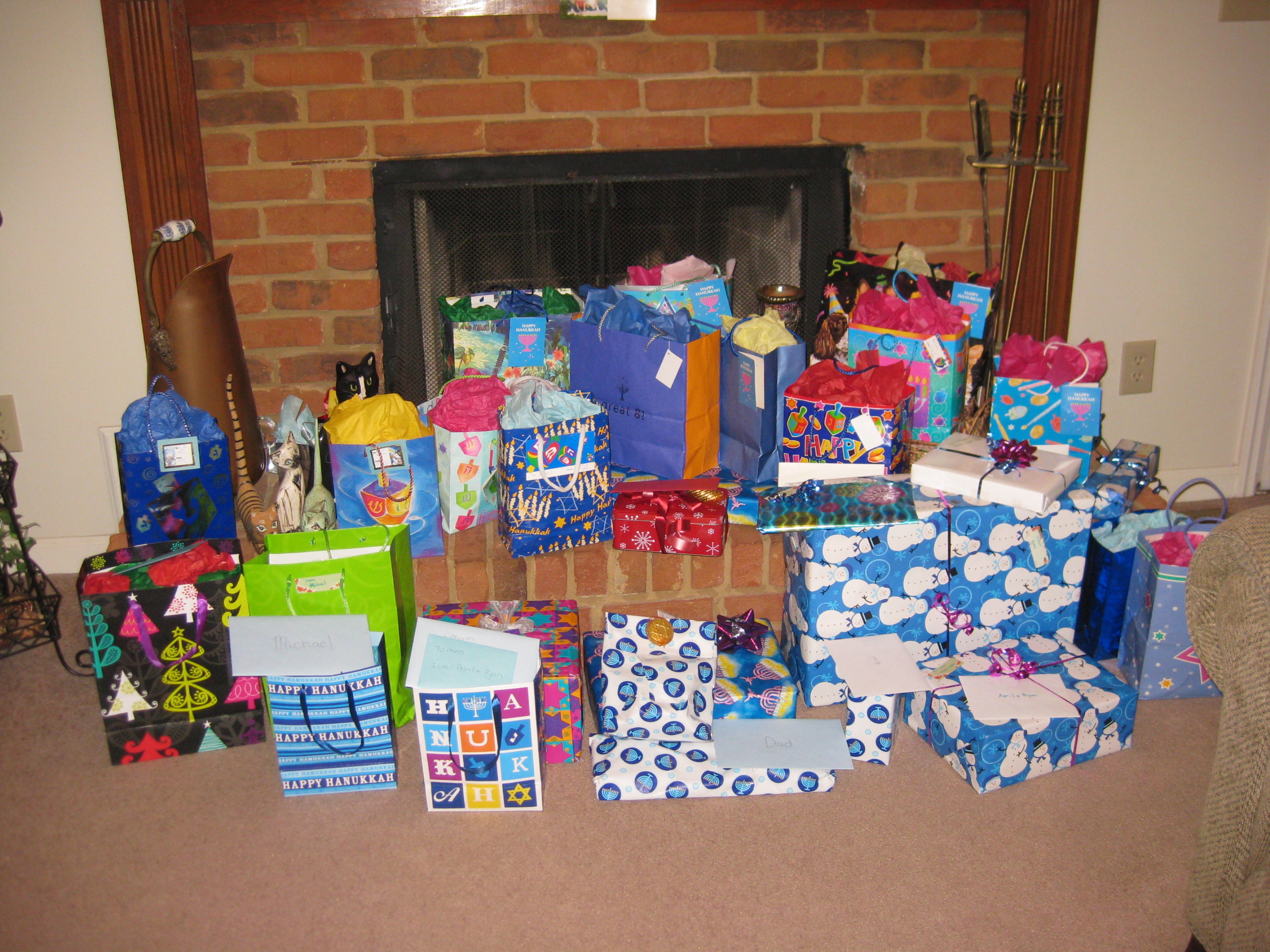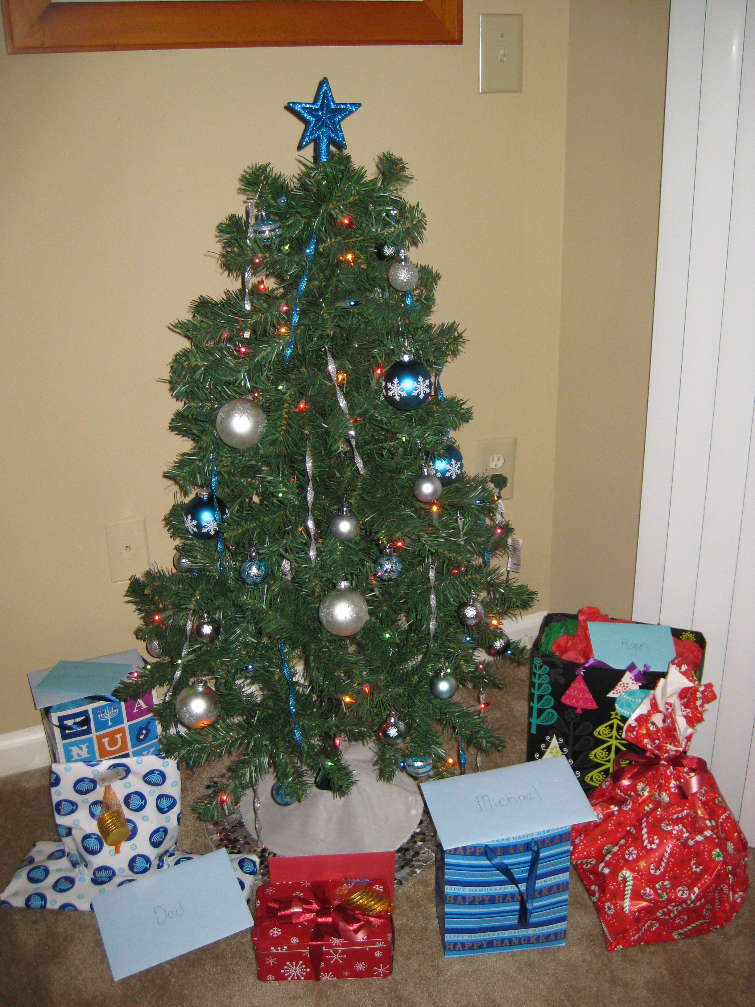 This past weekend we put up our tree. When we first got the tree, we lived in an apartment. We decided to get a 4-foot tree since we did not have that much room. Since it was my first tree, we wanted to incorporate Hanukkah into the tradition. So we got all blue, white and silver ornaments. Glass and plastic balls, glittery icicle ornaments, a sequined silver tree skirt and a blue glittery gold star topper. We call it the Chrismahanukkah tree. Now that we are in a house, we still use the same tree. I imagine when we get our own house; we will buy a bigger tree and more ornaments. All of the presents don’t usually fit under the tree, so we put a large majority of them on the fireplace next to the tree. I also decorate for Hanukkah and we have a lot of decorations all over the house. I’m really happy with how our house looks all decorated right now.